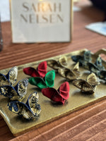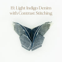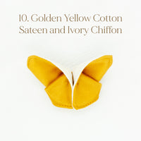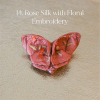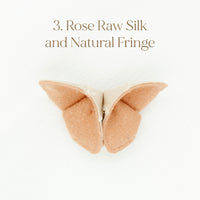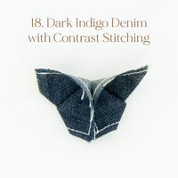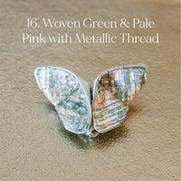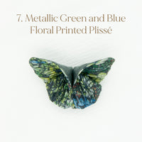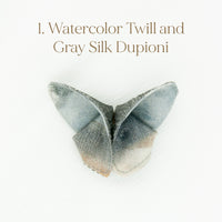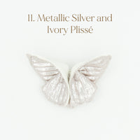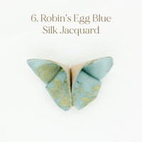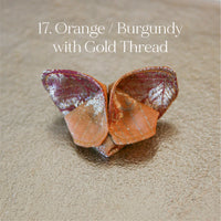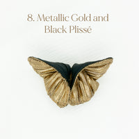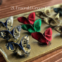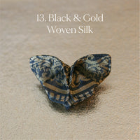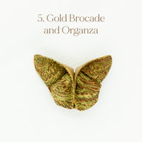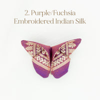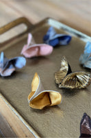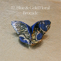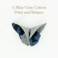 The Butterfly Brooch is made from two contrasting fabrics folded and sewn origami style to achieve a dimensional shape. A coordinating metal pin is sewn to the back.