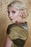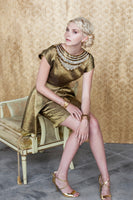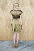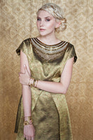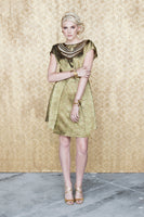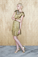 This sheath dress features long triangular peplums radiating from the darts at the waistline. An elegant neckline and capped shoulders balance out the strong peplum feature. This style works well in woven fabrics such as brocades. Exposed brass zipper at center back. Fully lined. The Emerald Green Peplum Sheath Dress in vintage silk features short peplums. Available for Custom Order with either a long or short peplum.