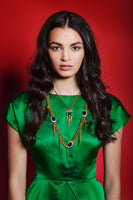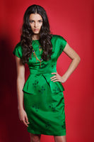 This sheath dress features long triangular peplums radiating from the darts at the waistline. An elegant neckline and capped shoulders balance out the strong peplum feature. This style works well in woven fabrics such as brocades. Exposed brass zipper at center back. Fully lined. The Emerald Green Peplum Sheath Dress in vintage silk features short peplums. Available for Custom Order with either a long or short peplum.