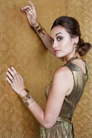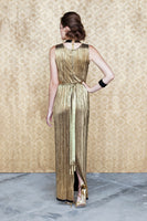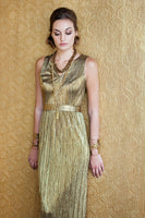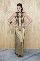 - Maria is 5’9.5” and wearing a Gold Column Dress in size Small, Long Length.