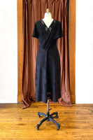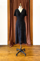 An interesting V-Neckline shape is created with overlapping sleeves that attach from subtle gathers at the lower back. Slim fitting through the waist and hips with fluidity at the hem. An attached bodice/skirt lining stops at the mid-thigh for an alluring peek-a-boo effect.