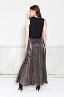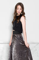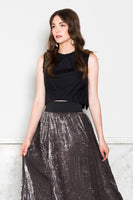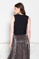 Curved seam lines on the front make this piece a standout. Back pleats at the hem radiate from shoulder tucks. Pair this piece with our Maxi Skirt for a complete look. The Sculptured Crop Top has a curved taper – slightly shorter in the front. Center back zipper. Fully lined.