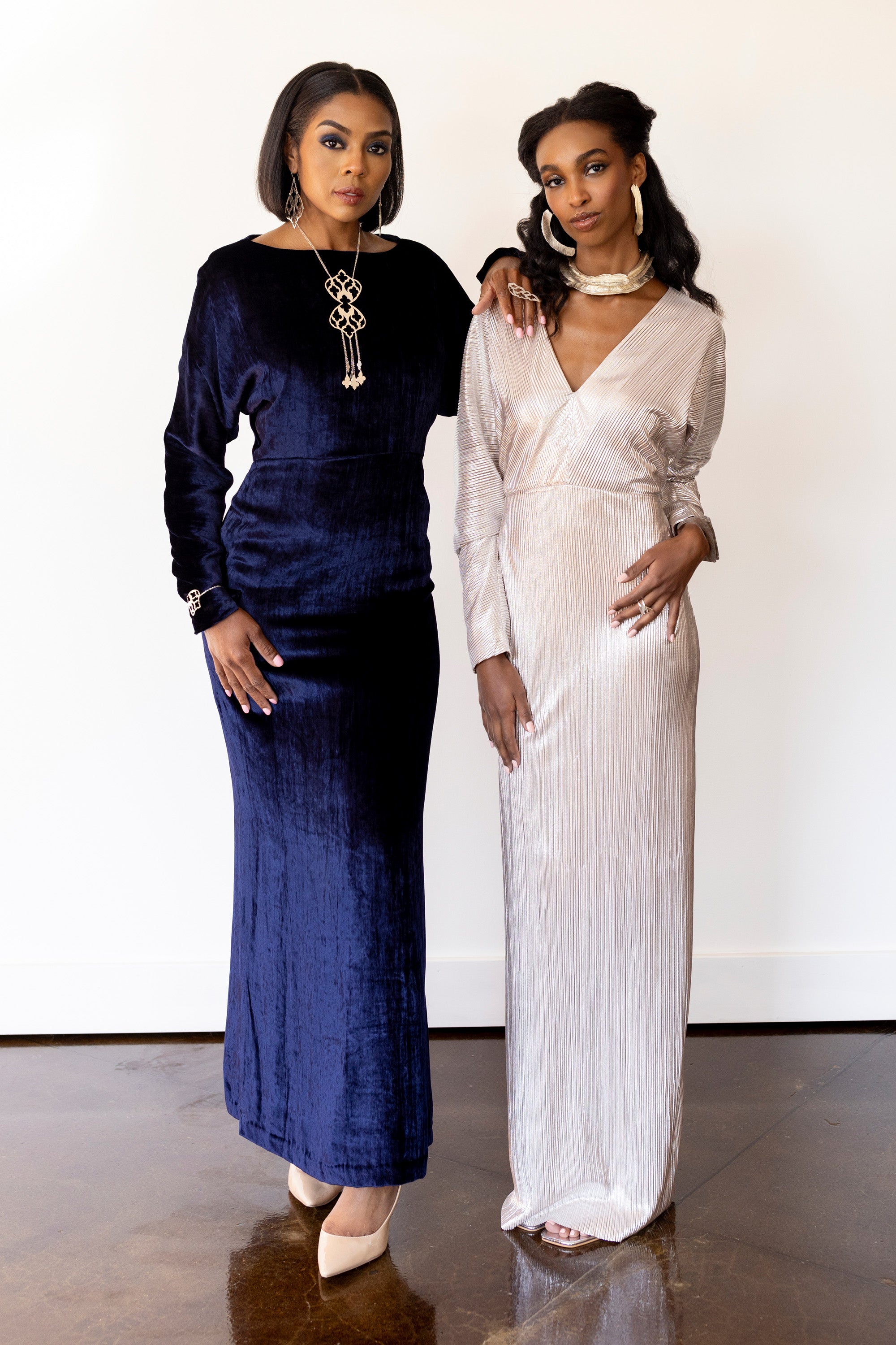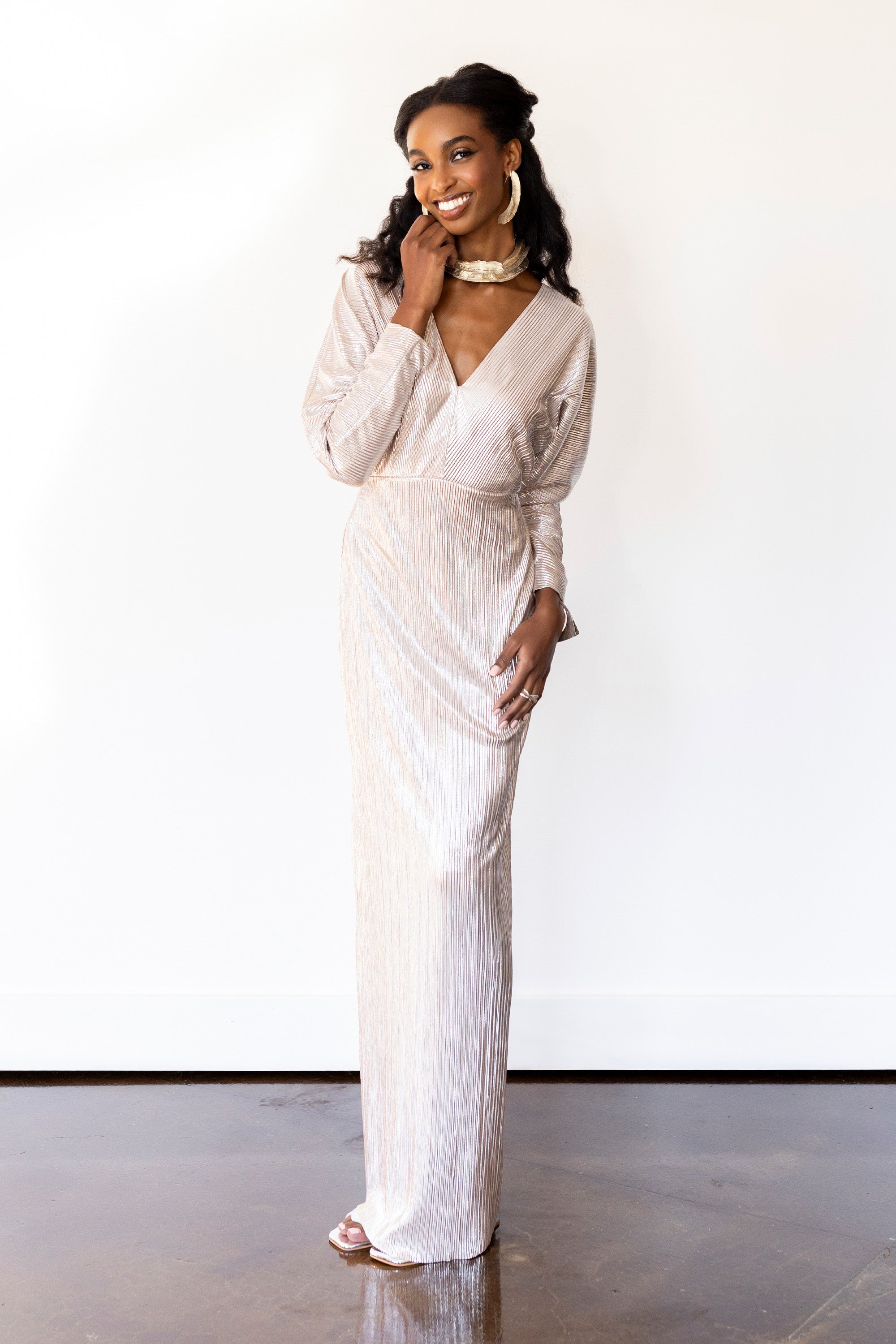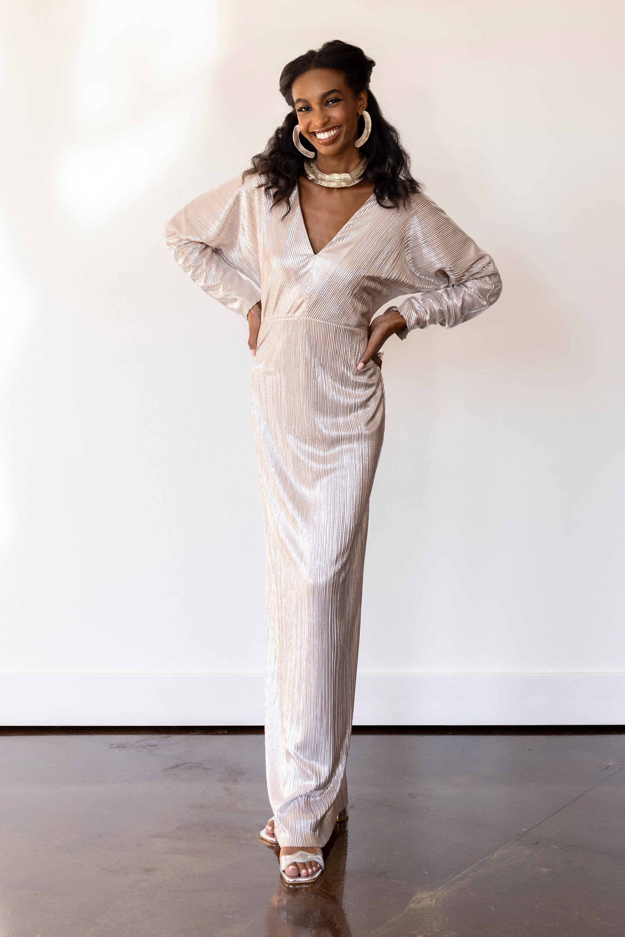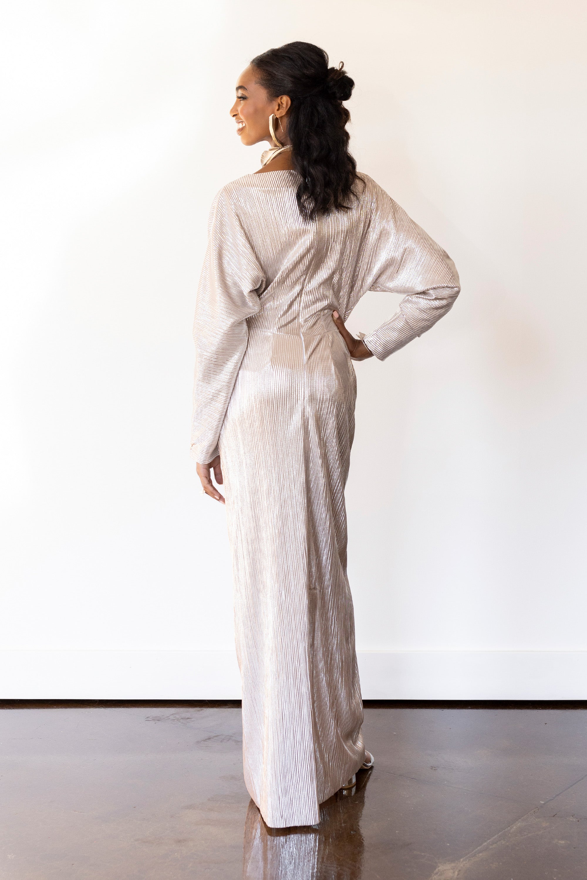 A body skimming column dress featuring a high waistline that dips to the back in eye-catching silver plissé and a dramatic V-neckline. The kimono sleeve style can be kept long or shortened to your desired length. Fully lined with a center back invisible zipper.